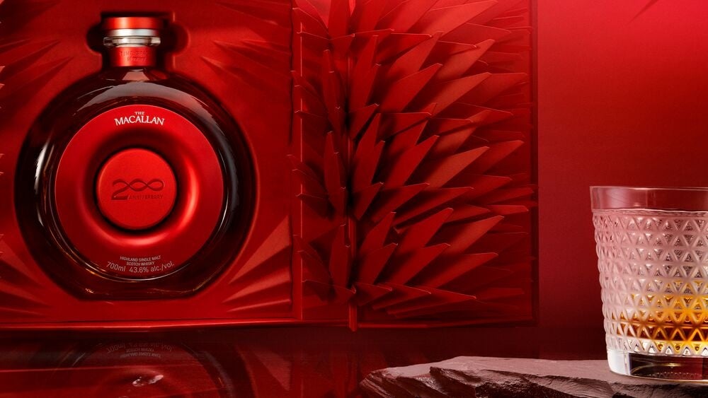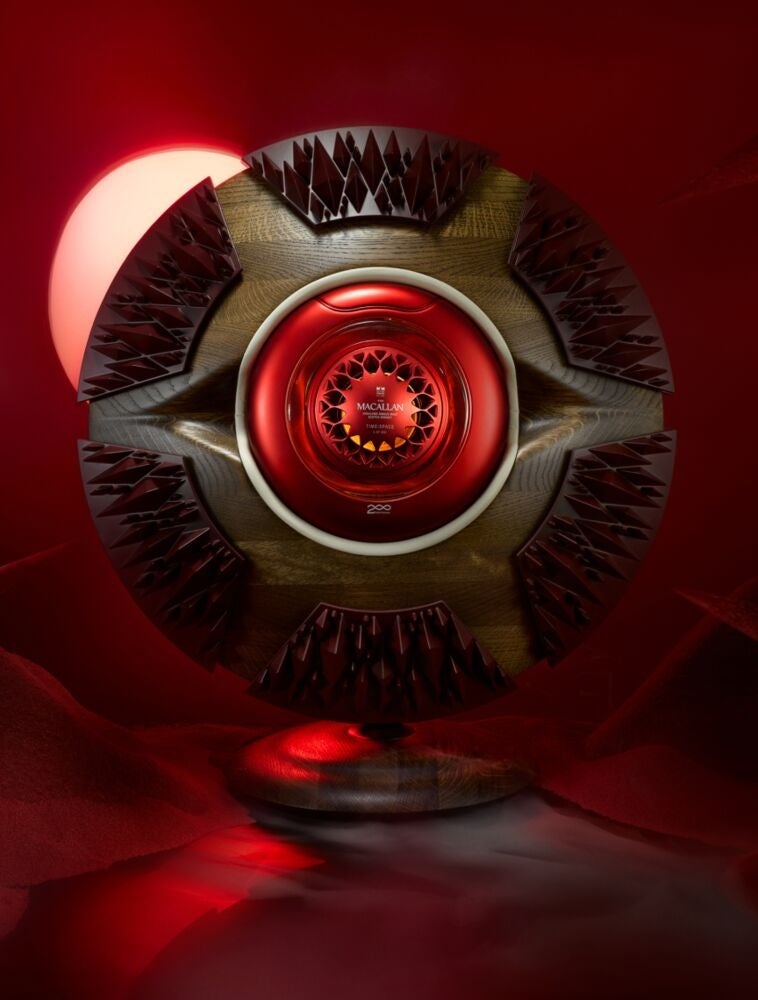 円形のボトル容器は、過去から未来へと続く終わりなき旅を表現しています。ケースはザ・マッカランを象徴する鮮やかな赤色で彩られ、最も貴重で繊細なものを200本のスパイクによって守る姿を表しています。複雑なディテールは、折り紙の技法からインスパイアされたそうです。