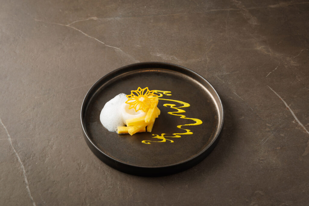 たとえば、6か月熟成の紅はるかと非加熱キャヴィアを組み合わせた一皿では、甘味と塩味、食感のコントラストを繊細な光の変化と共に味わうよう計算されています。藁焼き鰹 × 河内晩柑、江田和牛生ハム × 洋梨 × トリュフ香るオムレツなど、多彩なマリアージュを、光と香りで演出する料理・デセールが次々と供されます。