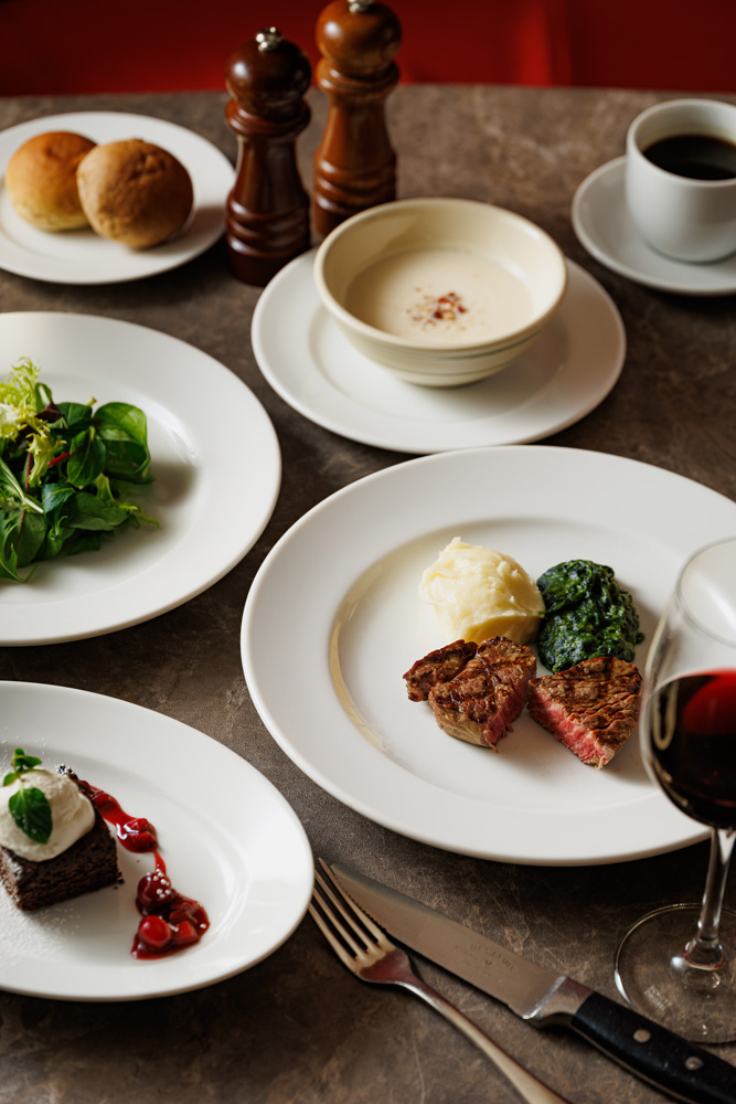 サラダ、スープ、ステーキ、サイドディッシュ、デザート、食後のコーヒーまたは紅茶まで含まれています。追加料金で季節の魚料理を組み合わせることも可能です。