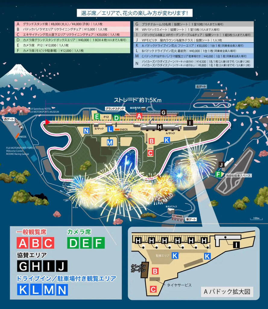 日中にサーキットを走り、夜は花火を楽しむ。会場の魅力を余すことなく味わえる構成です。