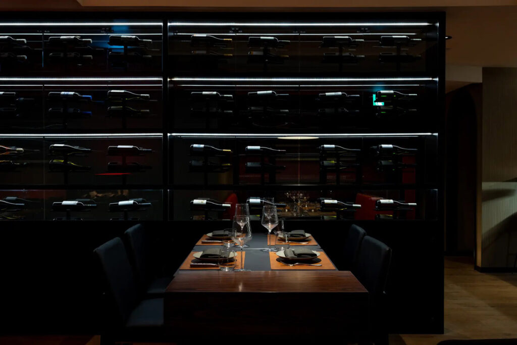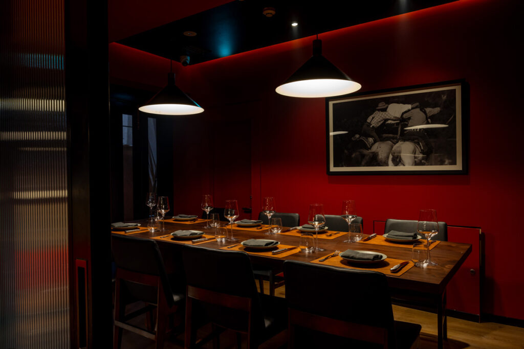 店内は黒と赤を基調にした上質なインテリアで、温かな照明が薪の炎を思わせる穏やかな雰囲気を演出しています。