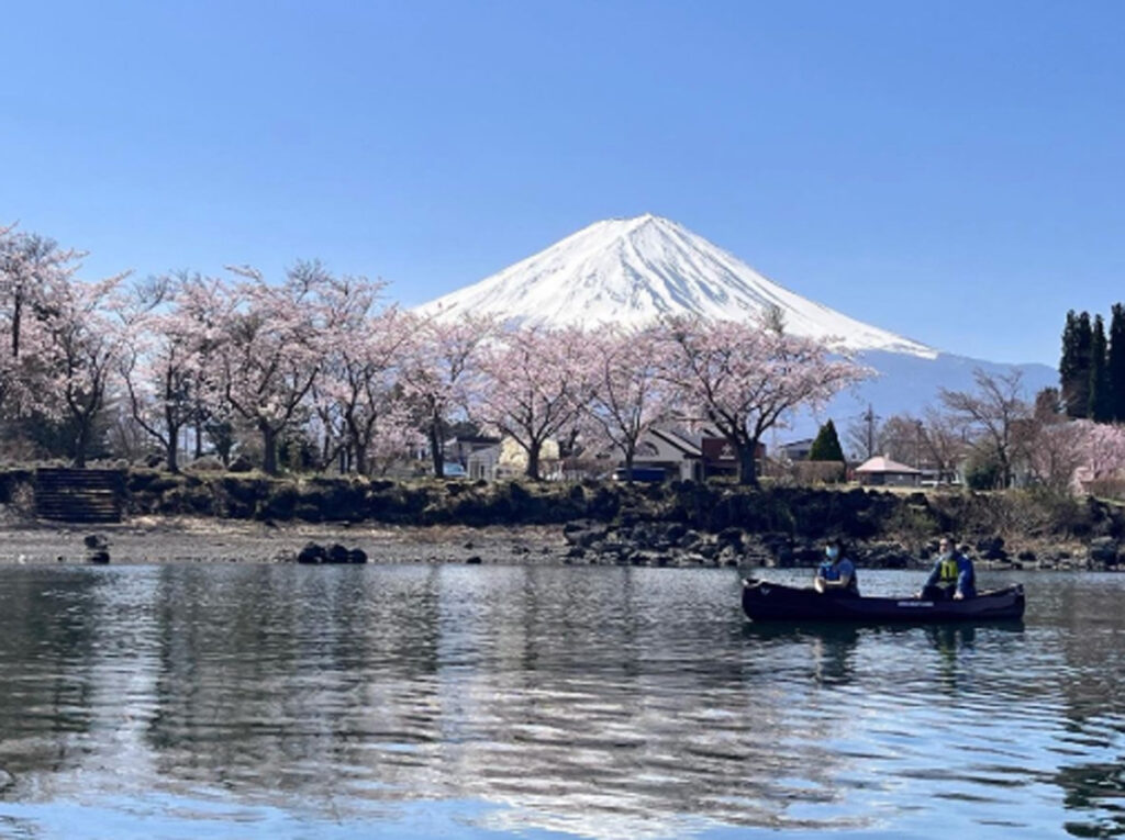 ベルトラが紹介しているプランの中には、山梨県・河口湖でカヌーに乗り、湖上から桜と富士山の景色を眺めるアクティビティもあります。水面に近い位置から眺める桜は、陸上とは異なる静けさを感じさせる景色です。